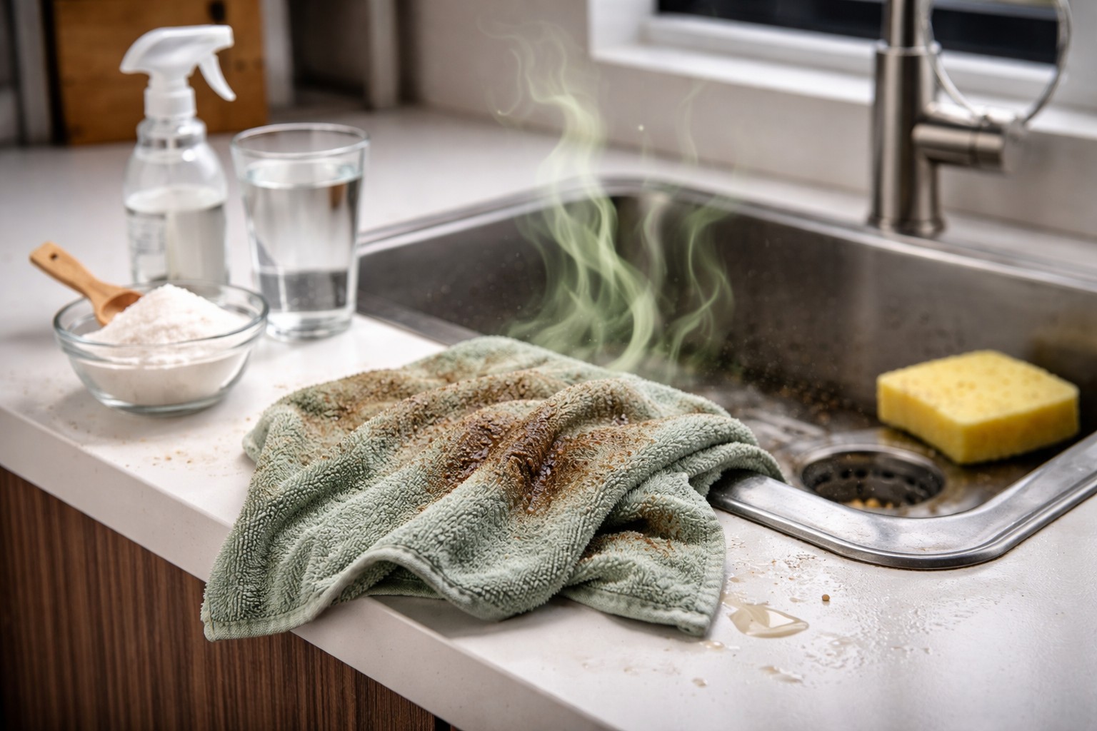 Glavni razlog neugodnog mirisa je sporo sušenje. Ostavite li vlažnu krpu zgužvanu na sudoperu, proces truljenja započet će za nekoliko sati.